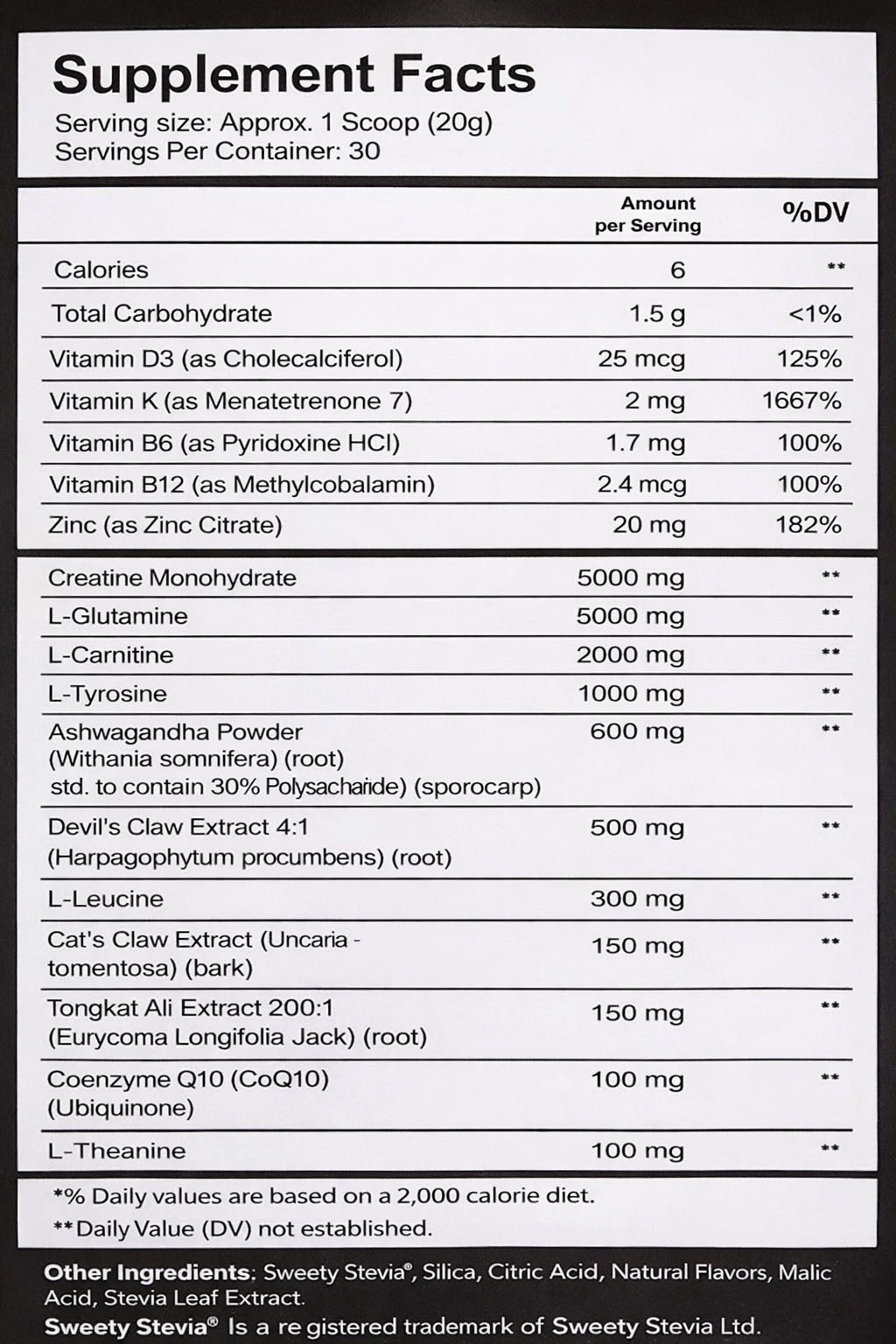 Leucine and Glutamine support muscle growth and repair, Carnitine turns fat into energy, Tyrosine and Theanine sharpen focus, and Creatine boosts power and performance.